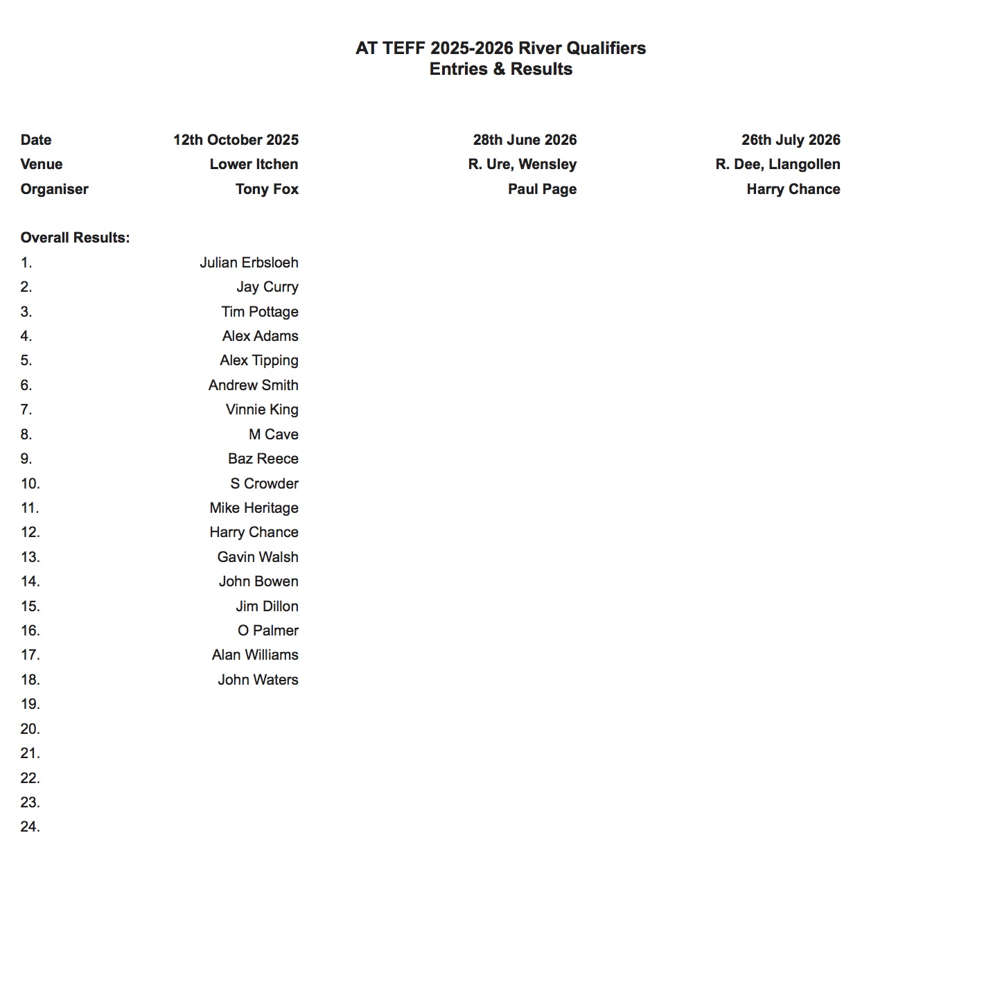 The Qualifier will be fished to IFFA Section A – Fishing rules and AT TEFF River Qualifier scoring system, on a Catch, Measure & Release basis. Both Trout and Grayling 20cms and above will be eligible for measuring, scoring & the awarding of fish points.