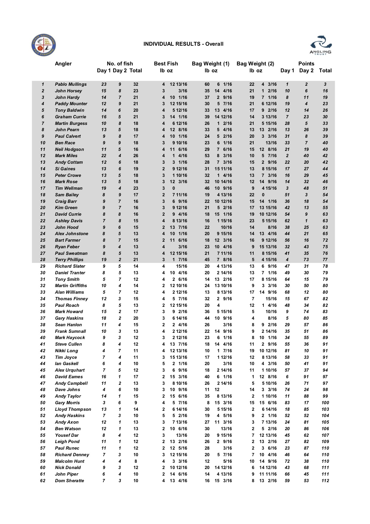 The top 28 anglers over the two days who now form the teams for next year are: