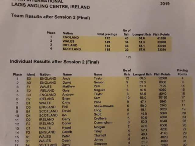 In first place with 112 place points were England, Wales were runners-up with 149 place points with Ireland third with 155 place points. Scotland were fourth with 185 place points. England also had three anglers in the top five with Andy Taylor crowned International Bank Champion with 12 fish, with David Neilson runner-up with nine fish and Andrew Taylor fifth with eight fish. Andy Taylor and Phil Shaw-Browne shared the longest fish with both anglers catching a fish of 58cm.