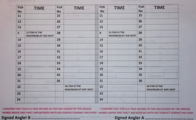 From 2020 one match card will be issued per boat with each angler scoring his boat partner’s catch.