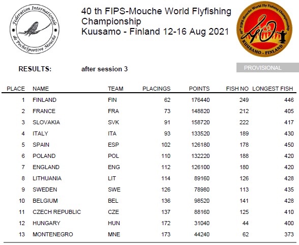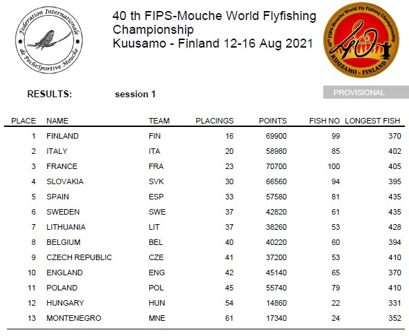 After a better performance in Session 2 AT TEFF England moved up to 5th place overall, thanks to a 1st place by Howard Croston with 31 fish on the Kuusinki river, and a 2nd by Harry Fox on the lower Kitkajoki. Terry Phillips scored an 8th place on the upper Kitkajoki, while on the lakes Scott Nellins landed 2 fish for 5th place on Kylmaluoma, with Davey Parker one of 8 competitors to blank on Koverrusjarvi. Individually, Valdimir Linda of Slovakia, Pierre Kuntz of France and Mikki Rasanen of Finland are the top three, all with 3 points, while Howard Croston is currently 9th.