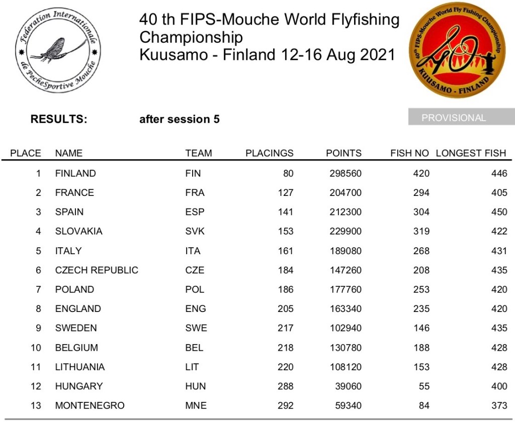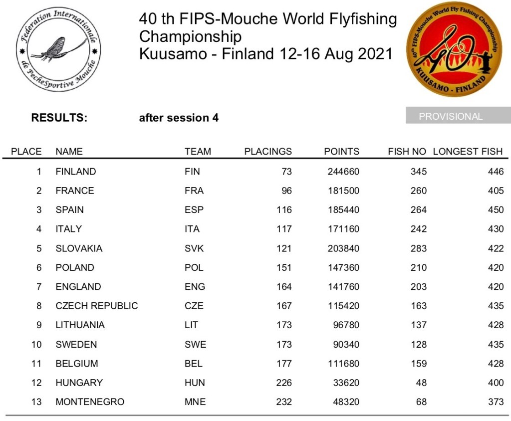 AT TEFF England held on to 7th place overall, with Terry Phillips getting a 6th place on the Kuusinki river, Howard Croston 8th on the lower Kitkajoki, and Scott Nellins 13th on the upper Kitkajoki. On the lake sectors, Harry Fox was one of the 7 competitors who failed to catch on the Koverrusjarvi, while despite an improvement in returns on lake Kylmaluoma, with 8 competitors scoring, Davey Parker was one of the 5 who failed to catch. Finland have consolidated their position in 1st place, 23 points ahead of France in 2nd, while Spain have overtaken Italy and Slovakia to move into 3rd. Individually, Heikki Kurtti of Finland retained his lead with 7 points, 3 points ahead of Jari Heikkinen of Finland and Pablo Castro of Spain.