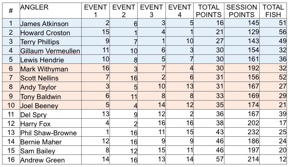 It was over to the afternoon anglers, with those now acting as controllers trying to figure out where they’d finished and if they’d done enough to make one of the teams. Del Spry continued his Day 1 form to win Group A, just ahead of Mark Withyman who was the only angler to catch on every peg. Howard Croston had done enough to win Group B and take the overall Event 4 victory.