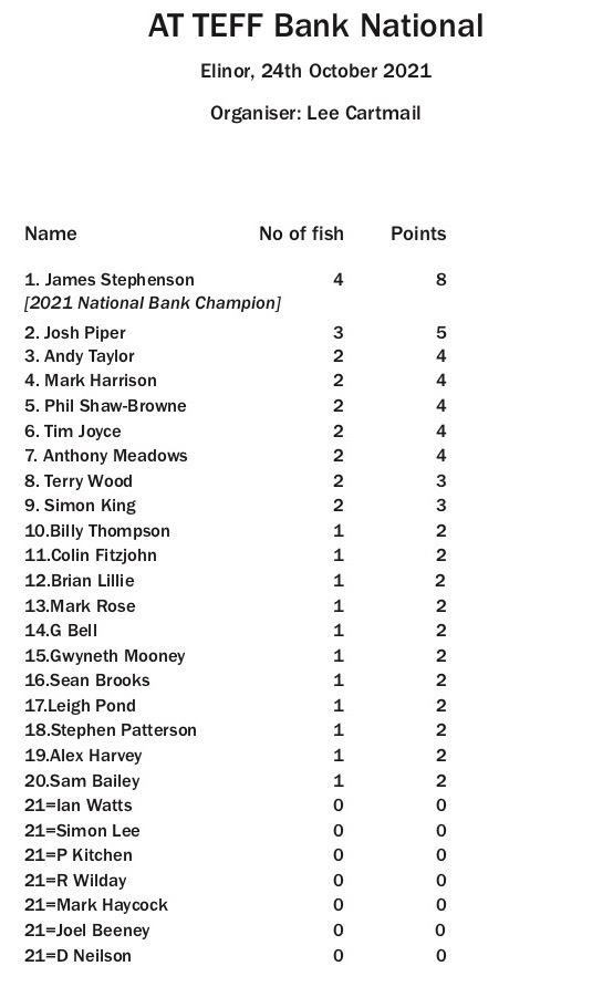 Elinor Fishery hosted this year’s AT TEFF Bank National, with 27 anglers fishing hard in awkward conditions for the prestigious trophy and places in the AT TEFF England bank team for 2022.