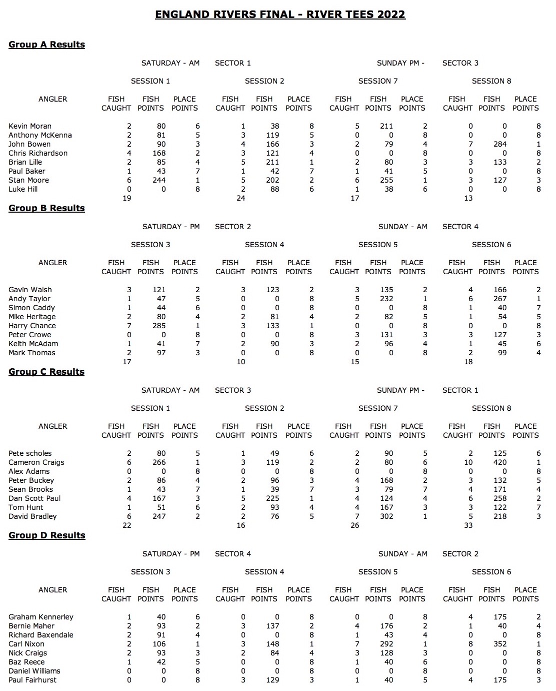 - Gavin Walsh 13 Fish Caught 545 Fish Points 8 Place Points