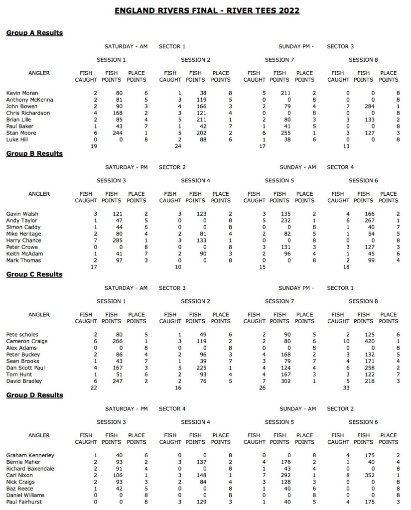 Congratulations to the 2022 National Rivers Champion Carl Nixon, runner-up Stan Moore, and Bronze-placed Gavin Walsh. Well done Cameron Craigs, Dan Scott, and Brian Lillie for achieving their squad places too. Well done all the anglers who qualified and a final thanks to Paul Page & Peter Scholes for organising a splendid event.