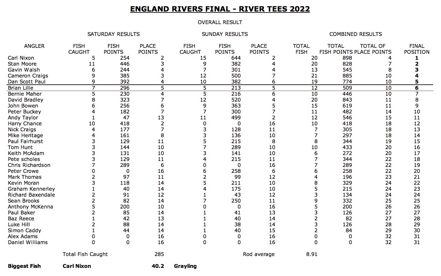 - Carl Nixon 20 Fish Caught 898 Fish Points 4 Place Points