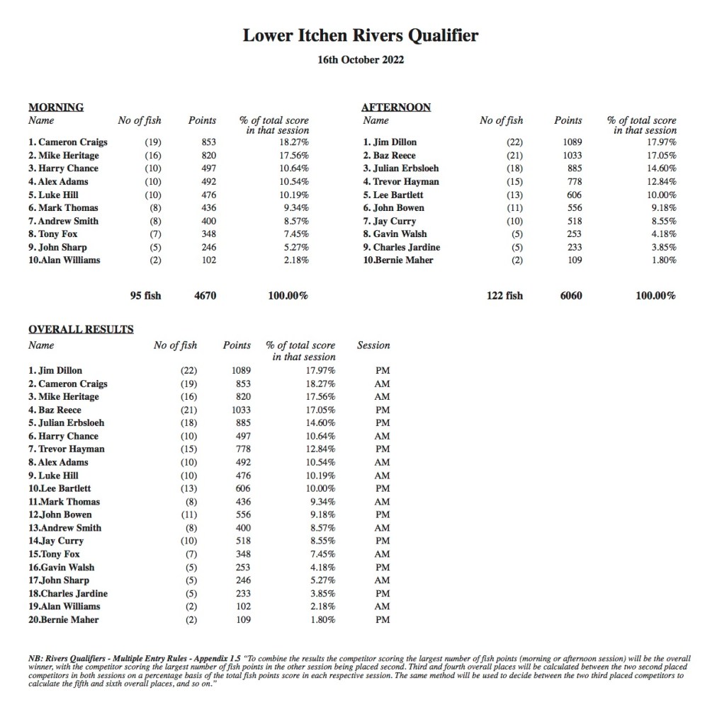 Matches will be fished to full international rules and the AT TEFF River Qualifier scoring system, to a Measure, Catch and Release basis. Only in season fish, 20cms and above, will be eligible for measuring / scoring / awarding fish points.