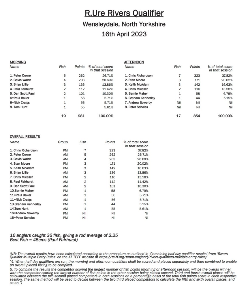 Paul Page, the event organiser, said that the early April Ure Qualifier was always a challenge as the grayling are out of season. Once the mist lifted in the morning there were abundant sedge hatches on the Wensley beat, however as the day progressed the cool breeze in the afternoon changed things. However, both Peter in the morning and Chris in the afternoon proved that if you had the right tactics and read the river well there were trout to be caught.