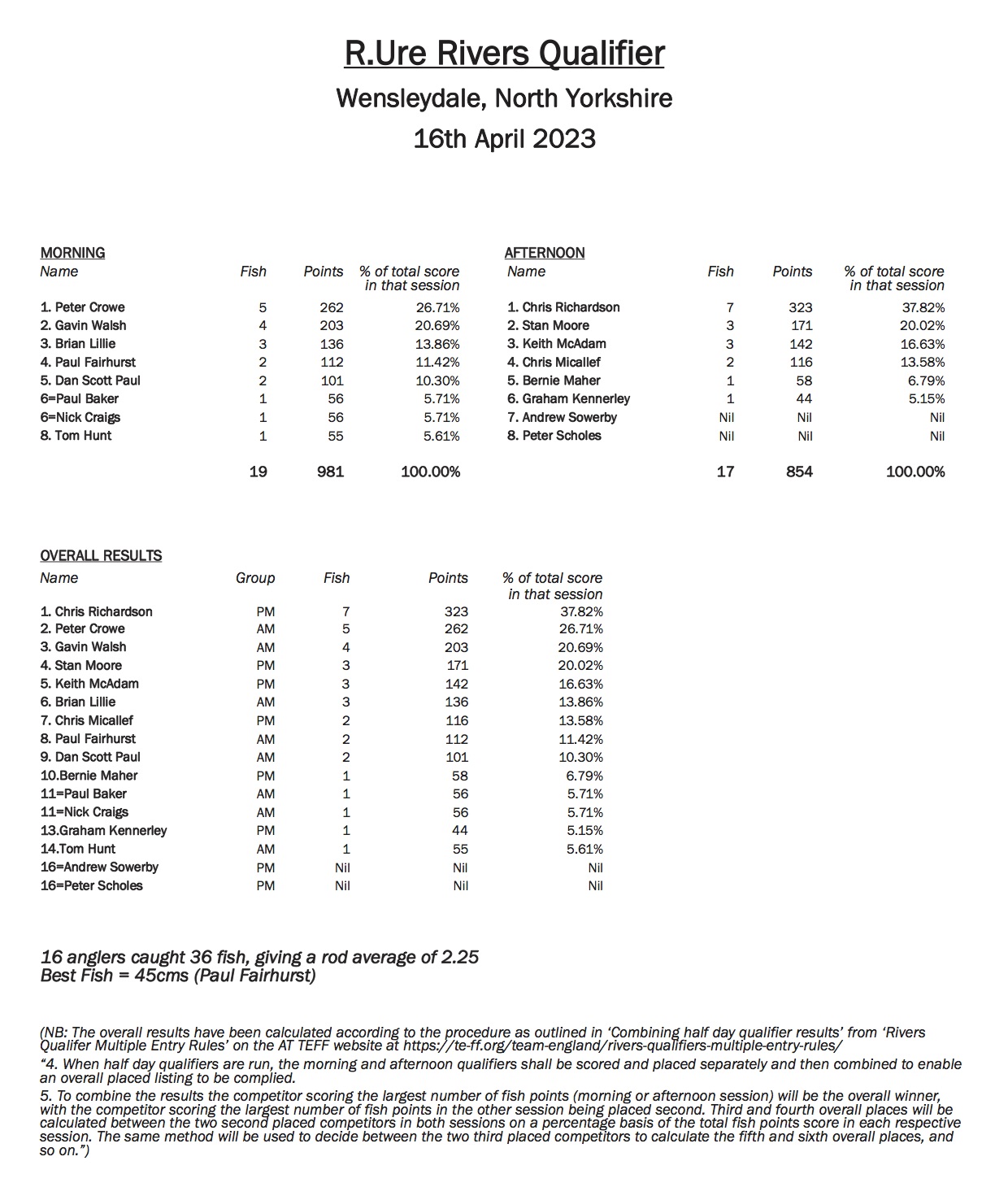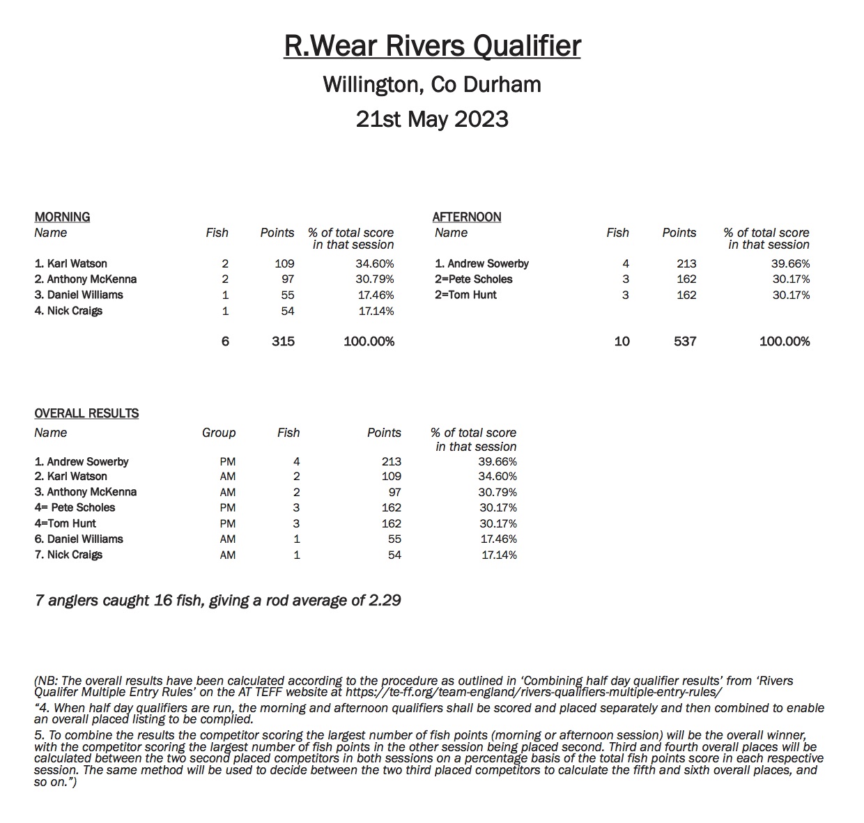 Matches will be fished to full international rules and the AT TEFF River Qualifier scoring system, to a Measure, Catch and Release basis. Only in season fish, 20cms and above, will be eligible for measuring / scoring / awarding fish points.