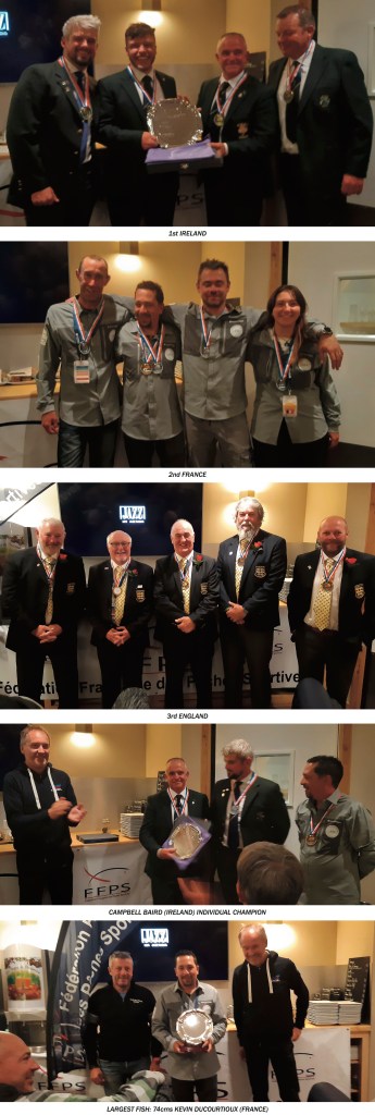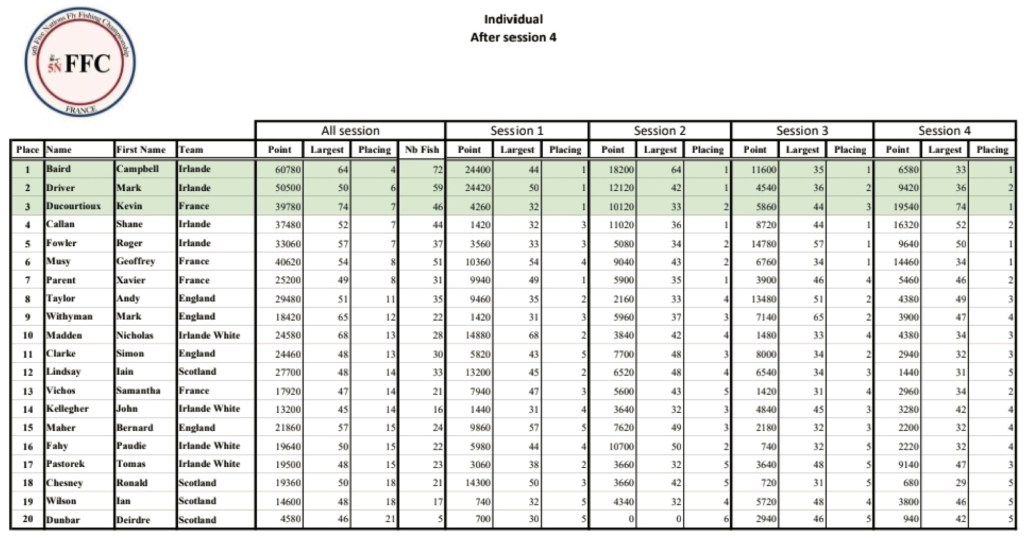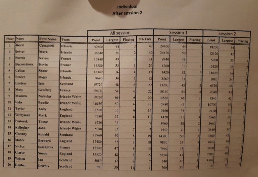 Session 2 saw 3rd places for Mark Withyman on Lac de Tueda, Simon Clarke off the bank on Barouchat, and Bernie Maher on the boats at Barouchat. On the other bank section on Lac de Tueda Andy Taylor scored a 4th place. England moved up one place to 4th, with Ireland holding on to their 1st place with 13 placing points, and France 2nd on 19pts. Ireland White are 3rd with 26pts, and Scotland 5th with 34pts.