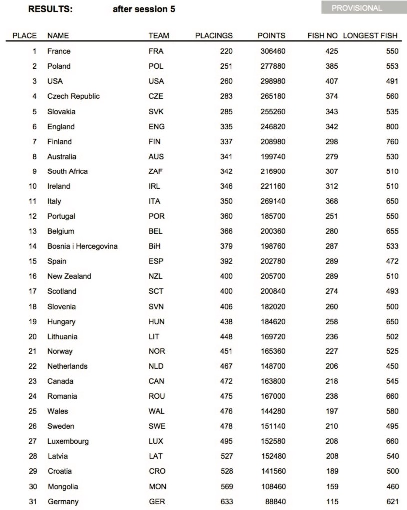 England had a mixed day in the 4th session. On Lipno 2, the boat sector, James Atkinson came 7th with 6 fish, but the team found it tough on the river sections, with Scott Nellins coming 22nd on Vltava 29 Devil’s Stones, Sean Brooks 23rd on Vltava 27 Rozmberk, and Brian Lillie 26th on Vltava 28 Vyssi Brod, while Howard Croston was one of 15 anglers to blank on Otava 5,6,7 Susice. England slipped down to 8th place with 266 placing points, while Scotland were 11th, Ireland 15th, and Wales 26th. France moved up into 1st place with 175pts, with Poland dropping to 2nd with 188pts, and the USA moving back up to 3rd with 213pts. Individually, another session win put Pierre Kuntz (France), already the World Champion in 2023 and 2024, on 7pts, and with a good chance of retaining his title for 2025.