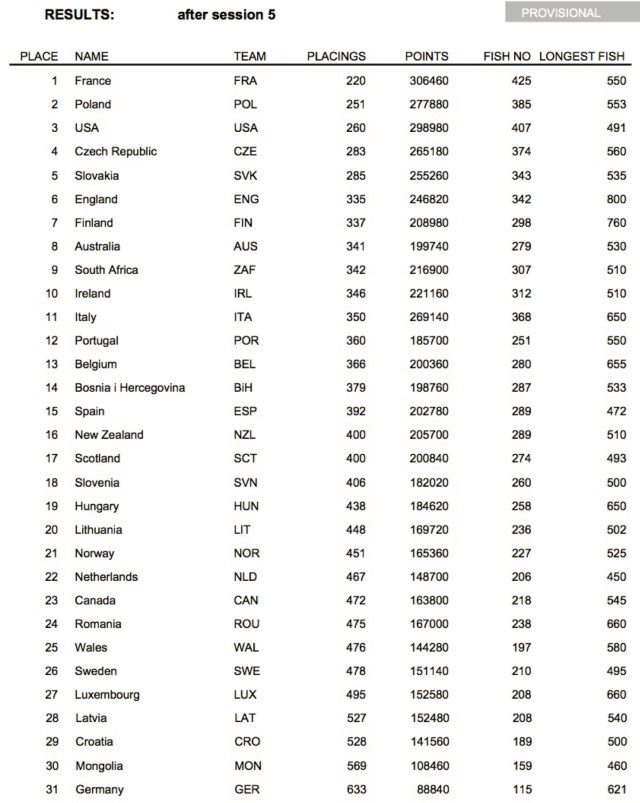 A better session for England saw Sean Brooks come 3rd on the Aude River with 18 fish, with Howard Croston finishing 5th on the Tet River with 12 fish, and James Atkinson also scoring a 5th place on the Camporells Lakes with 10 fish. Elsewhere, Scott Nellins came 10th= on the Carlits Lakes, with Chris Richardson 19th= on the Vicdessos River. Despite this, England remained in 14th place, with Ireland also not moving from their 7th spot. Three 1sts, a 2nd and a 3rd saw France remain comfortable leaders with 55 placing points, ahead of Spain 2nd with 137 points, the USA 3rd with 152 points, and Italy in 4th place with 161 points. Individually, the top four positions did not change, with Sebastien Delcor (France) 1st on 7 placing points, Michael Bradley (USA) 2nd, also with 7 points, Pierre Kuntz (France) 3rd with 8 points, and Gregoire Juglaret (France) 4th on 9 points.