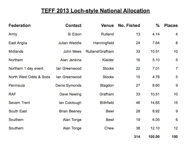 Invitations have been sent out to all qualifiers to the Team England FF 2013 Loch-style National. Cheques for £60 (covering costs of boats, fishing, food and administration for the day) must be sent to organiser John Mees no later than Monday 5th August.